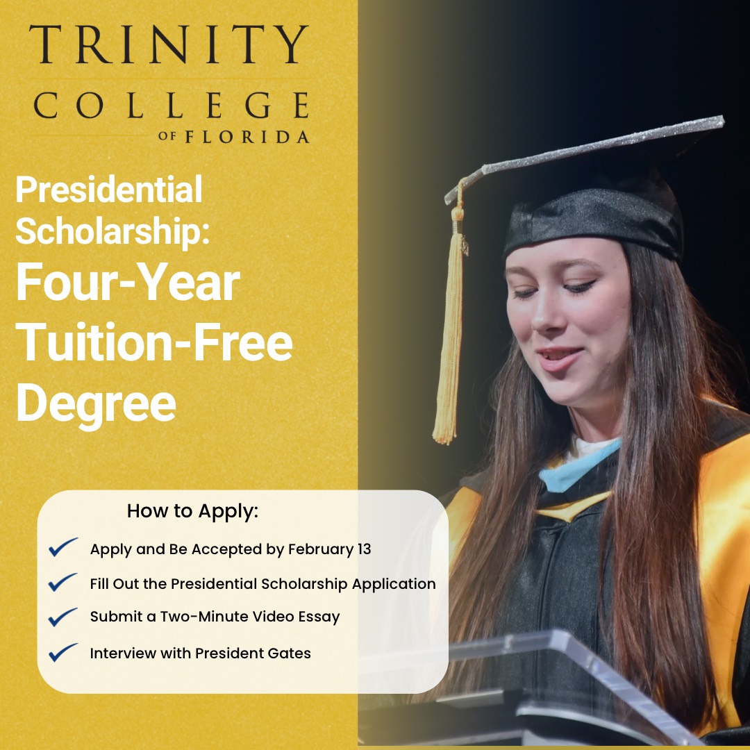 The Presidential Scholarship reflects Trinity College of Florida’s mission to prepare students intellectually, spiritually, and practically for lives of faithful service. Qualified students are encouraged to apply prayerfully and consider how Trinity College of Florida can partner with them in fulfilling God’s calling. Apply by February 13th.